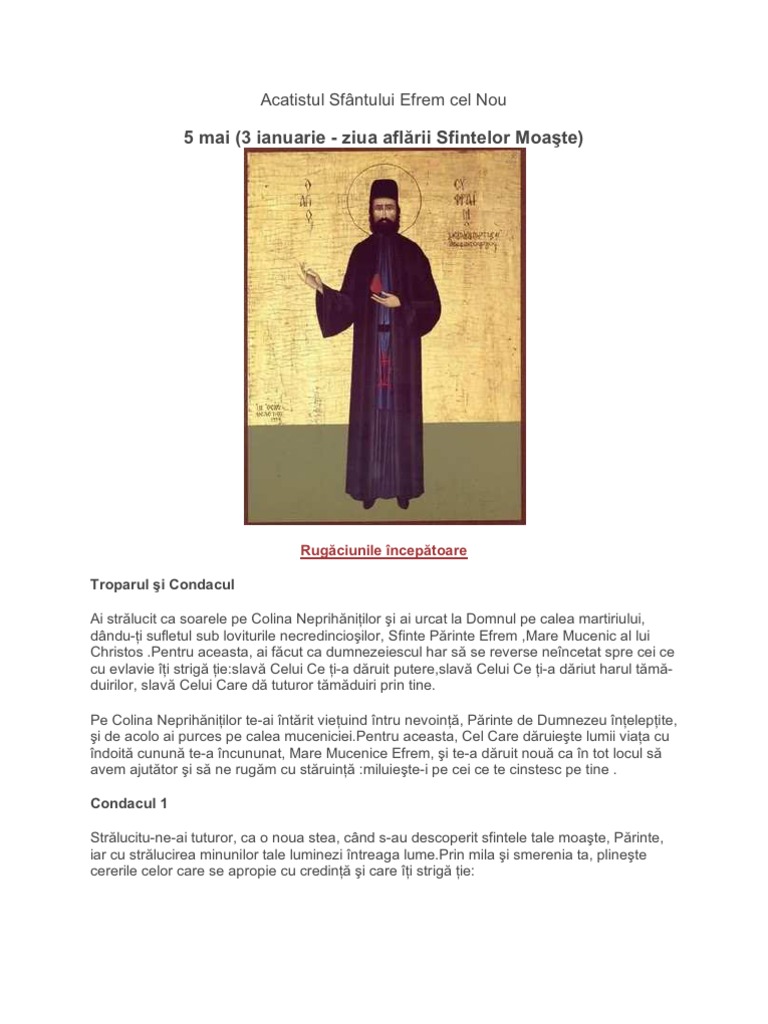 Sfântul efrem cel nou este de asemenea ocrotitorul copiilor, prunci nascuti, dar si nenascuti, în pântecele mamei. Acatistul sfantului efrem cel nou obisnuitul inceput pentru orice acatist mai intai se zic rugaciunile incepatoare de este preot, începe aşa acatistul sf. Sfinte mare mucenice efrem, ascultă rugăciunea mea, a păcătosului, şi vino în ajutorul meu. Rugăciune a sfântului efrem sirul. Efrem cel nou , sfant nou mucenic si tamaduitor 5 mai, moartea muceniceasca/3 ianuarie, aflarea cinstitelor sale moaste sa.