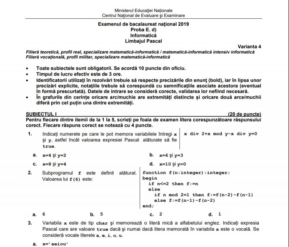 Bacalaureat 2019 subiecte informatică bareme edu.ro. Astăzi, 18 iunie, a avut loc examenul la disciplina la alegere. Astăzi a fost ultima probă scrisă din cadrul examenului de maturitate.