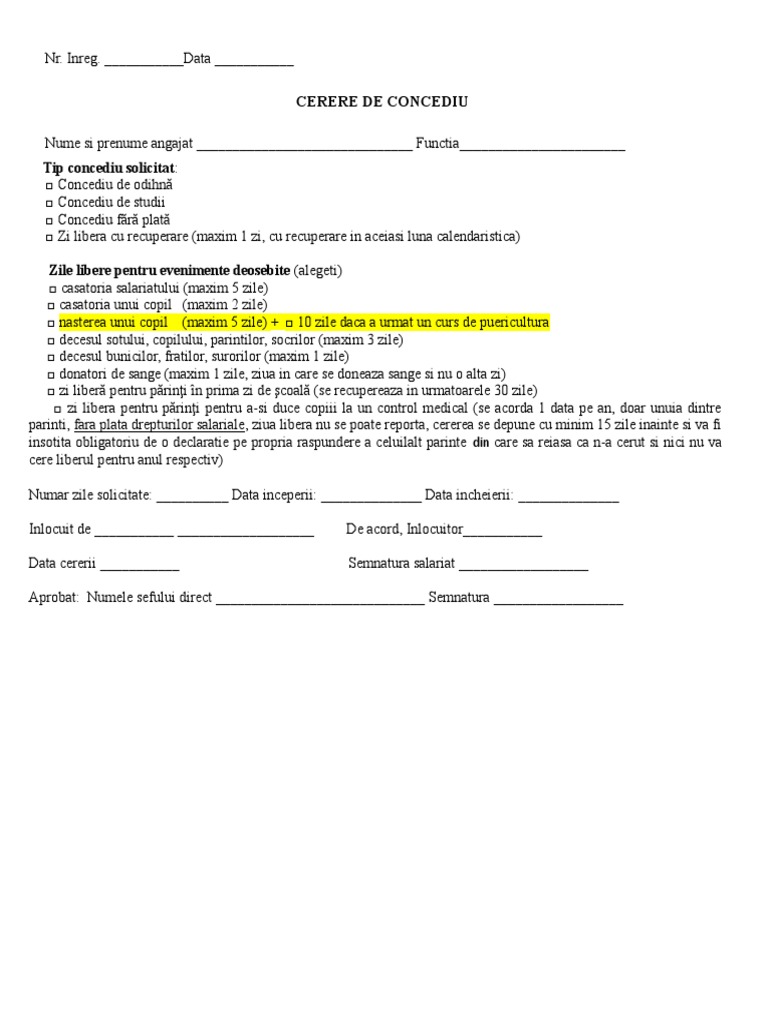 Nici o data nu cred ca avem suficiente zile de concediu. Formular cerere concediu fara plata download gratis in format pdf word doc. Se poate acorda doar la cererea angajatului (angajatorul nu poate forta angajatul sa isi ia.